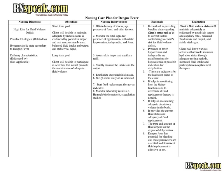 Dengue Fever Nursing Care Plan High Risk For Fluid Volume Deficit - There is no cure for dengue nor dengue hemorrhagic fever.