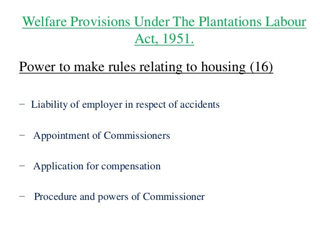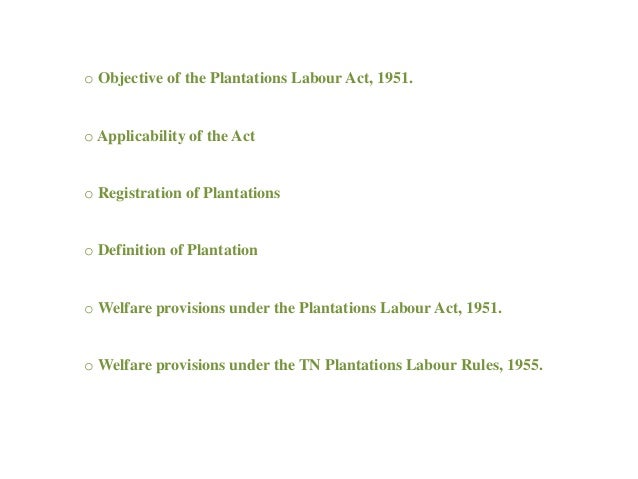 Plantation Act 1951 Plantation Act 1951 : The plantation labour act 1951, to provide for the welfare of labour, and to regulate the conditions of work, in plantations.